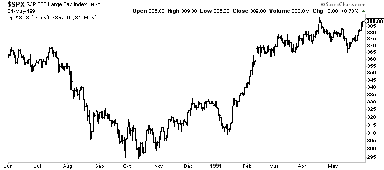 Then it reversed. When Desert Storm launched in January 1991, the conflict ended in six weeks. Oil crashed 33% in a single day and fell back below $20 by March. The Dow rallied 17% in four weeks. The S&P 500 hit new all-time highs by February 1991 — less than four months after the bottom.