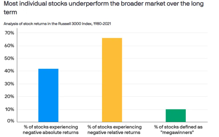 The 66% Drag: Two-thirds (66%) of all stocks in the Russell 3000 between 1980 and 2021 actually delivered negative relative returns compared to the index.