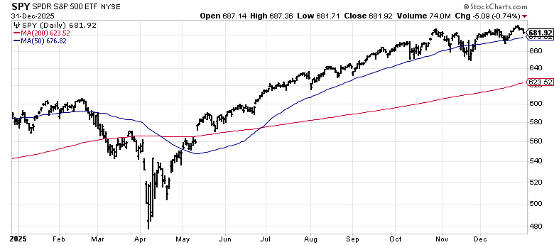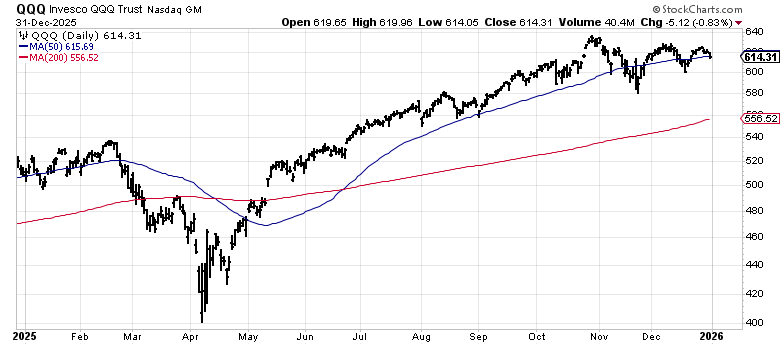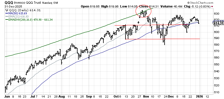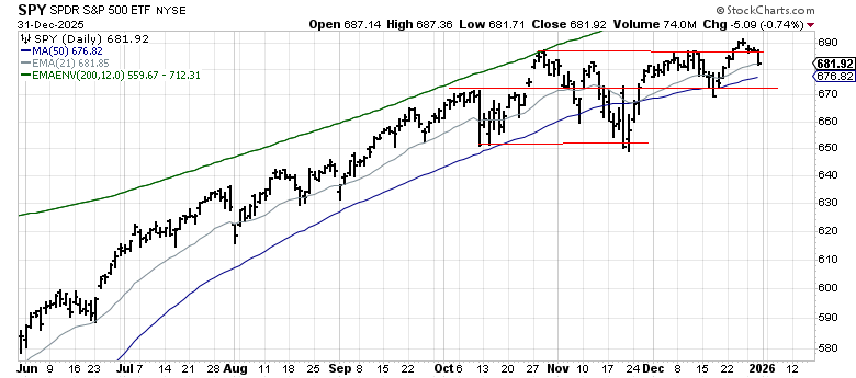 Analysis: After testing resistance in late November, the index pulled back below the 50-day Moving Average (Red Line). We are now seeing a “Higher Low” form—a classic bullish structure. As long as price stays above $672, and the 21EMA above the 50SMA, the trend is healthy.