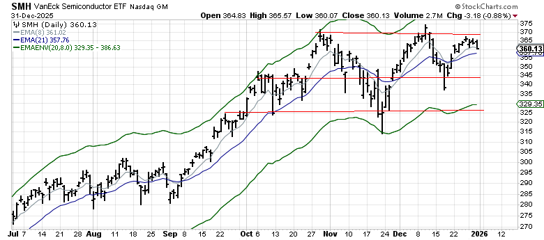 Technical View: The recent pullback in the Semiconductor ETF SMH 0.00%↑ appears to have been a temporary lull rather than a trend change. The group is cycling higher again, and we are watching for the trend to continue into a decisive breakout above $370 resistance to confirm the next leg up.