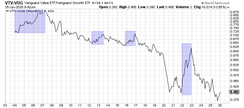 It is no secret that Growth tends to outperform Value. However, Value tends to have short bursts of relative outperformance, generally not exceeding a 12-month period. The chart below highlights Value’s relative outperformance of periods greater than 12 months. This occurred 4 times in the last ~23 years.