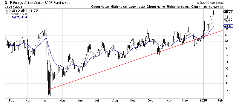Fueling up: Jumpstarted by the Venezuela debacle, Energy stocks look terrific. Breaking above $47 which marked resistance for the past 2 years is a feat worth noticing. Led by XOM 0.00%↑ and CVX 0.00%↑. Recently making new all-time highs.
