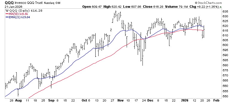 Advanced Analysis: Tech continues to lag. Closing today above the Red 50SMA line is encouraging considering the volatility yesterday. However, lack of leadership in MSFT 0.00%↑ META 0.00%↑ etc. makes things challenging. This remains in a neutral trend, correcting via time rather than price.