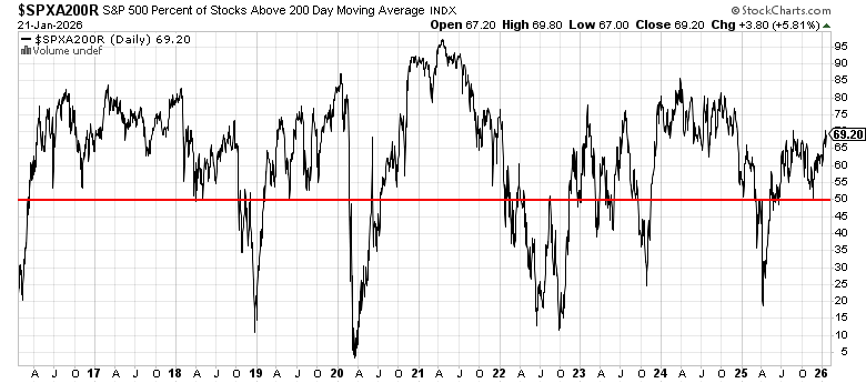 69% of S&P 500 stocks are ‘Above the Red Line’ (the 200SMA). Historically, a value above 50% is sign of an uptrend.